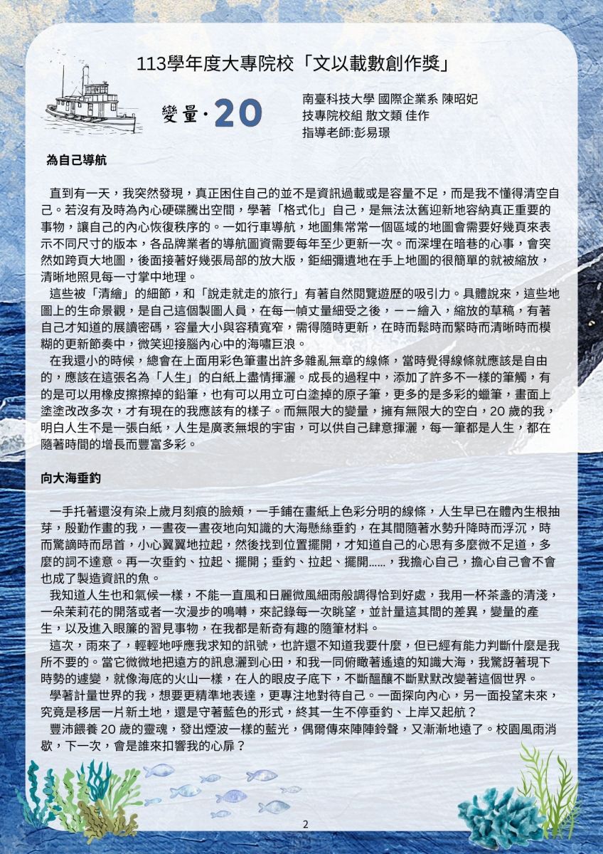 在我還小的時候,總會在上面用彩色筆畫出許多雜亂無章的線條,當時覺得線條就應該是自由的,應該在這張名為「人生」的白紙上盡情揮灑。成長的過程中,添加了許多不一樣的筆觸,有的是可以用橡皮擦擦掉的鉛筆,也有可以用立可白塗掉的原子筆,更多的是多彩的蠟筆,畫面上塗塗改改多次,才有現在的我應該有的樣子。而無限大的變量,擁有無限大的空白,20 歲的我,明白人生不是一張白紙,人生是廣袤無垠的宇宙,可以供自己肆意揮灑,每一筆都是人生,都在隨著時間的增長而豐富多彩。